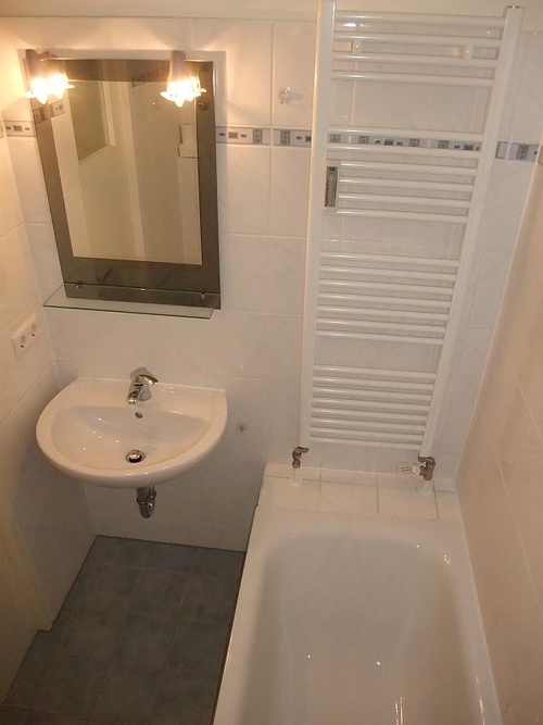 Das Bad besitz ein Wannenbad, ein Waschbecken und eine Toilette. Ein Handtuchtrockner ist ebenfalls vorhanden.