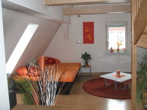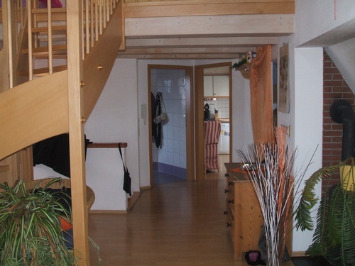 Die im Dachgeschoss befindliche Maisonetten Wohnung ist in einem 4-Familienhaus. Sie wird von viel Licht durchflutet. Über eine Buche Treppe gelangt man in das offene Wohnzimmer, das Bad ist mit einem Linoleumboden, einer großen Duschwanne bzw. Badewanne ausgestattet. Im Bad befindet sich alles was man braucht, um sich wohl zu fühlen. Der Balkon ist ein idealer Ort, um die Sonnenuntergänge zu beobachten. Zimmerböden sind mit Buche Laminat ausgelegt. Zur Ausstattung der Wohnung gehört eine abgeschlossene Abstellkammer, ein Kaminofen und eine schöne Einbauküche. Durch eine weitere Buche Treppe gelangt man in das Schlafzimmer. 2011 wurde eine neue Gas-Zentral- Heizung eingebaut. Es werden immer wieder Erneuerungen vorgenommen. Internetanschluss (DSL) sowie Satellitenschüssel sind vorhanden. Rücklagen sind gebildet. Das Haus wird durch die vier Eigentümer selbstverwaltet, dadurch reduzieren sich auch die Hauskosten die im Moment 60 € betragen, darin sind alle Versicherungsbeiträge und alle Wartungs- und Reparaturkosten enthalten. Eine Besichtigung lohnt sich!
