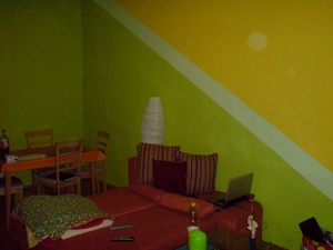 Die Wohnung ist komplett mit Laminat verlegt. Außerdem haben wir gerade frisch tapeziert bzw. gemalert.