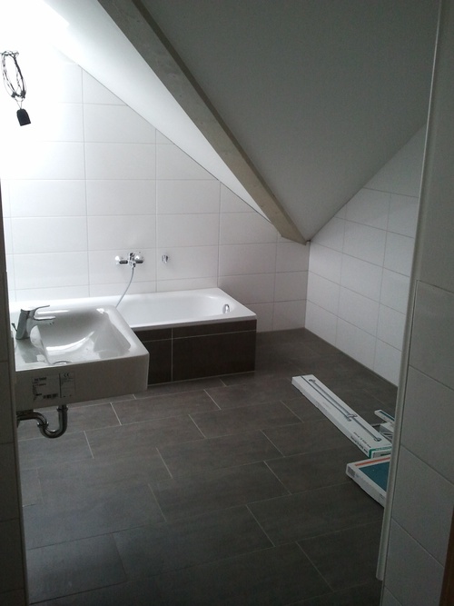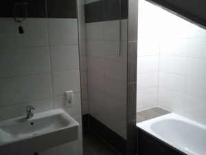 Das Tageslichtbad ist mit Wanne, Dusche, WC und Waschmaschinenanschluss ausgestattet.. Zu der Wohnung gehören ein Keller und eine Garage.