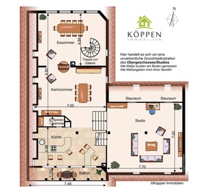 Eine halbe Etage höher befindet sich der größte Fläche . Hier finden Sie die Küche mit Speisekammer, eine Ecke mit kleiner Bar, der Zugang zum überdachten Südbalkon, das Kaminzimmer mit einem großen, gemauerten Kamin sowie ein weiterer Wohn-Essbereich. Über eine Breite Holztreppe mit wenigen Stufen gelangen Sie in das offene Wohnstudio mit mehr als 50 qm und einer Deckenhöhe von 4,70 m (im Firstbereich). Von hier haben Sie auch einen schönen Blick hoch zur Galerie.