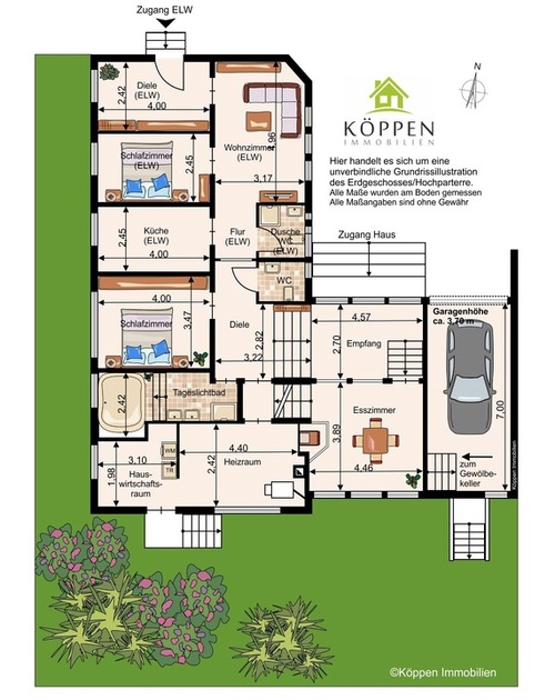 Im Erdgeschoss betreten Sie eine großzügige Diele, von hier gelangen Sie eine halbe Etage tiefer ins Gartengeschoss. Hier befindet sich das WC, das Tageslichtbad sowie das Schlafzimmer (auf dieser Ebene befinden sich 4 weitere Zimmer mit einem Bad, die zu einer Einliegerwohnung umgebaut und von der Hauptwohnung durch eine Wand getrennt wurde).