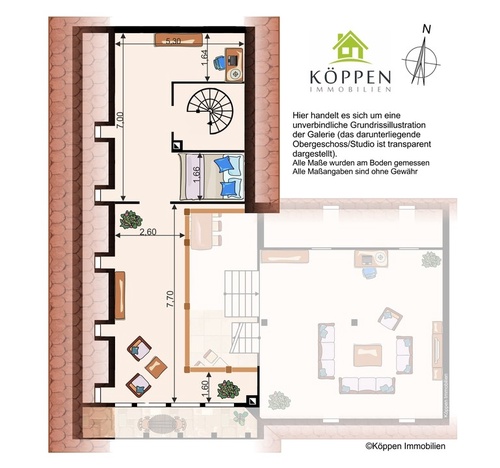 Die Galerieebene erreichen sie über eine Wendeltreppe. Auf der Galerieebene gibt es ein kleines Arbeitszimmer und einen Schlafbereich für Gäste. Von der Galerie blicken Sie auf die untere Wohnebene mit dem Studio dem Kaminzimmer usw. Außerdem haben Sie durch die bodentiefen Fenster auf der Giebelseite eine herrliche Aussicht in den Garten.