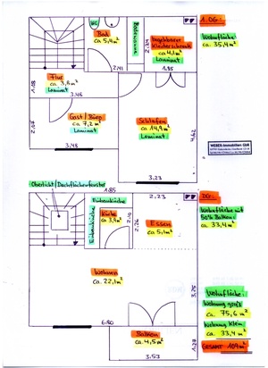 Im 1.OG und 2.OG (Pultdach) befindet sich die zweite Wohnung, die in der unteren Etage (1.OG) aus einem großen Schlafzimmer mit angrenzendem, begehbaren Kleiderschrank, einem innenliegenden Wannenbad und einem weiteren Raum (Gäste- oder Arbeitszimmer) besteht. In der oberen Etage befindet sich die Küche mit EBK und der lichtdurchflutete Wohnbereich mit Zugang zu dem nach Süd-Westen ausgerichteten Balkon.