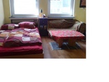 Heller Wohn-/Essbereich mit breiter Fensterfront und diskret abgetrenntem Schlafbereich. Alles mit schönem Parketimitat ausgestattet.