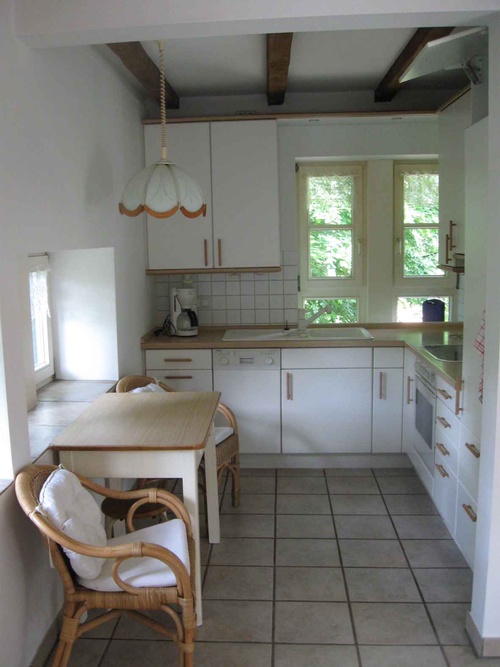 Es handelt sich hierbei um eine sonnige, großzügige Zweizimmerwohnung in einem 1994 ausgebauten Heuboden, noch zu erkennen an der Balkendecke und den z. T. erhaltenen Stützbalken. Sie hat einen eigenen Eingang getrennt vom Haupthaus. Der große Wohnraum ist mit einer offenen, hellen Küche mit Geschirrspüler und erhöhtem Kühlschrank verbunden. Auf dem ca. 15 m² großen Westbalkon mit Blick ins Grüne kann man den Tag wunderbar ausklingen lassen.