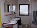 Das große Bad mit zwei Waschbecken, Dusche, Toilette und einem großen Schrank für die Utensilien.