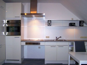 Helles Ein-Raum-Appartement mit hochwertiger, moderner Einbauküche in weißem Hochglanzlack und Kleiderschrank, Esstisch mit zwei Stühlen; ein weißes IKEA-Bett; Nachtschrank; eine komfortable Sitzecke mit einem weißen Ledersofa von ROLF BENZ und dazu passendem Ledersessel; Wohnzimmertisch; TV-Flachbild-TV mit integriertem HD-Sat-Empfang sowie WLAN; 1 hochwertige Mini-Stereo-Anlage; ein Küchentisch mit zwei Stühlen, ein Bett mit komfortabler neuwertiger Matratze.