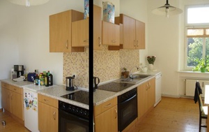 modernisierter Altbau provisionsfrei zu beziehen, mit schönen Holzdielen und gefließtem Wannenbad, günstige Küche mit Ceran-Herd, Spülmasch. und Fliesenspiegel, Keller vorhanden, Dachboden kann mitbenutzt werden, WG-geeignet
