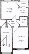 Aufteilung: Wohnzimmer mit ofener Küche (19 qm), Schlafzimmer (14 qm), Diele (3,5 qm), Duschbad (3,5 qm), Loggia mit Blick ins Grüne.