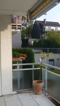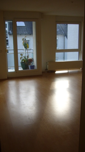Von der geräumigen Diele aus gelangt man in alle Räume. Das große, helle Wohnzimmer und das Kinder-, Arbeits- oder Esszimmer haben eine Tür zum Balkon, der nachmittags Licht und Sonne bietet, aber auch mit einer elektrischen Markise ausgestattet ist. Das Bad hat neben Waschbecken und WC eine große Dusche, Platz für Schränke und eine Waschmaschine. Die Küche enthält eine Einbauküche, die übernommen werden kann, in die aber auch ein kleiner Tisch passt. Das Schlafzimmer liegt ruhig und hat wie die Küche Außenrolladen. Neben einem separaten Gäste-WC gibt es noch eine Abstellkammer in der Wohnung, einen Kellerraum und einen PKW-Stellplatz.