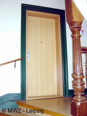 * Treppenhaus im Erdgeschoss mit Fliesenfußboden und Steintreppen, in den oberen Etagen mit Holzfußboden & -treppe Holz mit gedrechseltem Geländerholmen