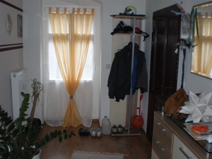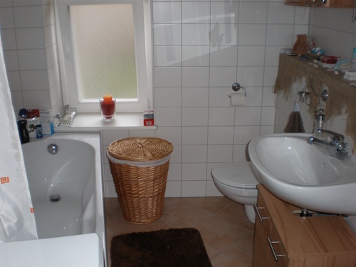 Die Wohnung ist mit dunklem Laminat verlegt. Das Badezimmer ist komplett gefliest mit Badewanne und integrierter Dusche.