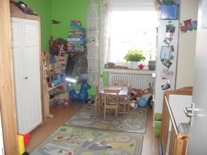 Die Wohnung verfügt über ein 14 qm großes Schlafzimmer. Dazu kommt ein 13 qm großes Kinder- bzw. Arbeitszimmer. Das helle lichtdurchflutete Wohnzimmer hat 19 qm und schließt unmittelbar an den überdachten Balkon an. Der großzügig geschnittene Flur kann auch als Essbereich genutzt werden. Das Bad ist deckenhoch weiß gefliest, der Boden weiß/grau meliert. Die restlichen Räume sind (bis auf die Küche) mit Buchen-Laminat ausgestattet. Neben der Küche befindet sich ein Vorrats- und Abstellraum. Selbstverständlich gehört zu der Wohnung ein eigener abschließbarer Kellerraum. Ein gemeinschaftlich genutzter Wasch- und Trockenraum steht allen Mietern zur Verfügung. Ein Aufstellen der Waschmachine in der Wohnung ist auch möglich. 2007 erhielt die Wohnung moderne Isolierglasfenster inkl. Rollladenkästen.
