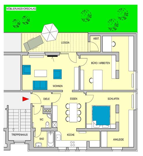 3 Zimmer, Wohnküche, Bad mit separatem WC, Diele, Abstellraum, Abstellschrank, großer Sonnenbalkon