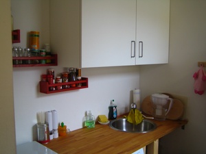 Bad mit Dusche, Küche mit Herd und Ofen; Dielen im Flur und Wohnraum; 500,- Euro Abstand für Hochbett, zwei Küchenschränke, Spüle mit Holzarbeitsplatte und Küchenfußboden.