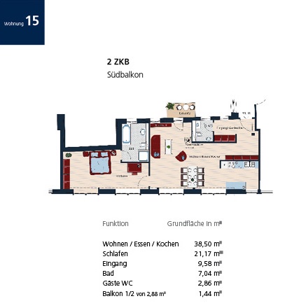 Von der offenen Küche bzw. dem Wohnbereich haben Sie einen schönen Blick auf den Balkon, welcher in Südausrichtung angelegt ist. Der Balkon befindet sich im historischen und ruhigen Innenhof.