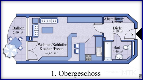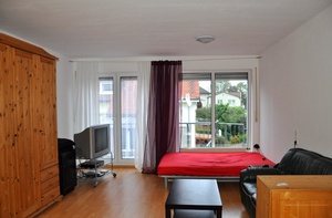 Die attraktive 1-Zimmer-Wohnung liegt ruhig inmitten einer gepflegten kleinen Wohnanlage. Das 26 m² große Wohn/Schlaf-und Esszimmer ist durch bodentiefe Fenster sehr hell und bietet reichlich Spielraum für Ihre Möblierung. Ein weiteres Highlight ist sicherlich der herrliche Sonnenbalkon (ca.6 m²). Helle, offene Einbauküche mit Einbaugeräten. Elegantes, deckenhoch gefliestes Duschbad mit Hänge-WC. Geräumige Diele mit ideal angepasstem Kleiderschrank. Zur Wohnung gehört ein nicht einsehbarer Abstellraum im Keller. Wasch- und Trockenraum werden gemeinschaftlich genutzt. Bei Bedarf kann ein Tiefgarenstellplatz dazu gemietet werden der direkt durch den Keller zu erreichen ist. Die Wohnung ist ab dem 1.03.14 verfügbar.