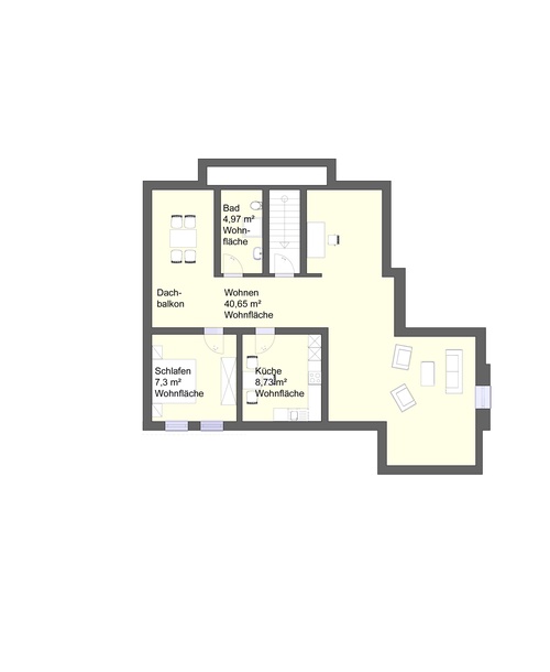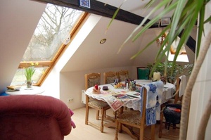 Das über die schmale Treppe aus erreichbare Dachstudio verfügt über einen großen, offenen Wohnbereich, der neben dem Wohnen, auch Platz für einen Ess- und einen Büroplatz bietet. Die geräumige Küche bietet ausreichend Stellflächen. Diese Wohnung besitzt zum Teil einen Echtholzparkettboden, das Duschbad ist mit weißen Fliesen ausgestattet.