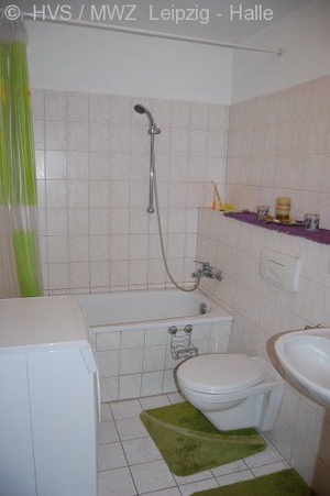 * Bad mit Waschmaschine, Wanne und Duschvorhang