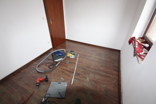 Dachterrasse, Fußbodenheizung, dunkles Laminat Nußbaum mit Fuge.