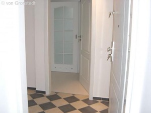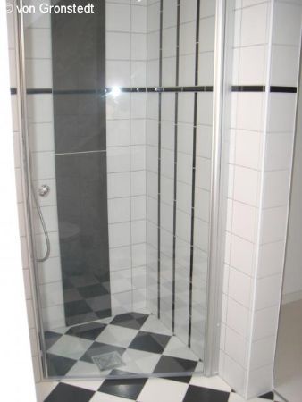 Alle Wohnräume sind mit hochwertigem Buche-Laminat ausgelegt. Die gefliesten Bäder und Flure bestechen durch ein edles schwarz-weißes Schachbrettmuster.