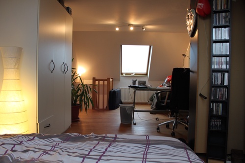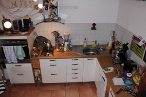 Der Vermieter hat sich bei der Renovierung vor ca. 2 1/2 Jahren sehr viel Mühe gegeben. Das Bad ist mit einer modernen Toilette, einer Glaskabinendusche mit Mosaikfliesen, einem schicken Waschtisch mit Unterschrank, einem Handtuchwärmer und Granitfußboden ausgestattet. ?Von der Diele aus kommt man in die Wohnküche. Hier ist eine Einbauküche mit Gasherd, Backofen, Kühlschrank mit Gefrierfach, Spülmaschine und viel Stauraum untergebracht. Die Küche gehört dem Vermieter und ist in der Miete enthalten! ?Von der Küche aus geht es nach oben in den Wohn-/Arbeits-/Schlafbereich. Hier ist ein gemütlicher Holzdielenboden verlegt.