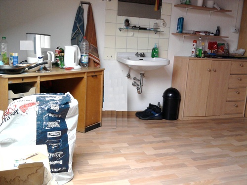 Die Wohngemeinschaft verfügt über Gemeinschaftsräume wie Bad, Küche und Toilette.