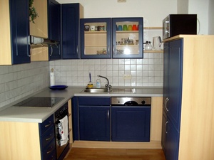 Die blaue, gut erhaltene Nobilia-Einbauküche mit Indesit-Geräten (Herd mit Ceranfeld, Ofen, Spülmaschine, Kühl-Gefrierkombi mit separatem Gefrierschrank) kann übernommen werden (1.200 € VB) und dies wird aufgrund des Zuschnitts der Küche sehr empfohlen. Die Waschmaschine wird in der Wohnung aufgestellt, hierzu besteht im Badezimmer die Möglichkeit. Ein Trockenraum befindet sich im Dachboden ein Stockwerk höher.