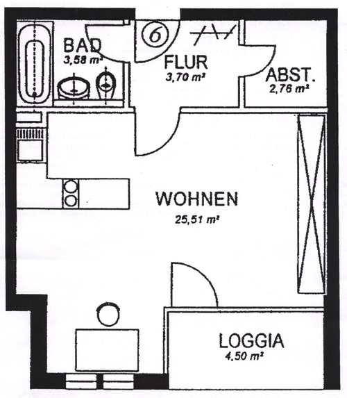 Die Wohnfläche beträgt 38 m² mit einem großen Balkon.