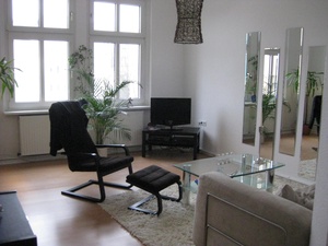 Die Wohnung befindet sich im 3. OG eines Altbaus im Berliner-Bezirk Schöneberg. Der S-Bahnhof Julius Leber Brücke ist eine Minute von der Tür entfernt, eine Haltestelle von Kreuzberg (Yorckstr.) drei Haltestellen von Potsdamer Platz und vier Haltestellen von Unter den Linden. Gleich um die Ecke gibt es einen Edeka- und einen Bio-Laden. 300 Meter weiter ist der Kaiser-Wilhelm-Platz mit vielen Geschäften: Drogerien, Aldi usw.