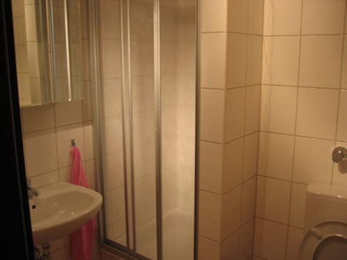 Dusche, Fliesen, Eßecke, Küche, Schlafzimmer, Stil: modern, Stil: zweckmäßig, TV, Waschmaschine, Trockner