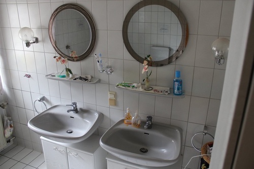 Wände: in allen Wohnräumen, Rauhfaser; Bad, deckenhoch weiß gefliest, Gäste-WC, Türhoch gefliest; Eingangsbereich, Kork (deckenhoch), Diele + Treppenhaus, Strukturtapete.