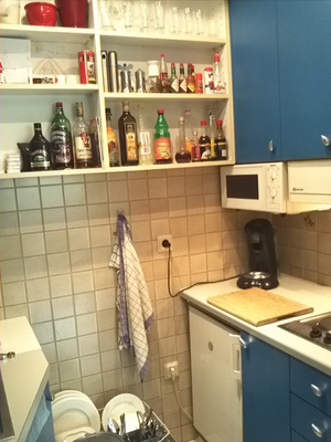 eine kleine eingerichtete Küche(Schränke, Herd mit 2 Platten, Geschirrspüler, Microwelle, Kühlschrank mit Gefrierfach) sowie