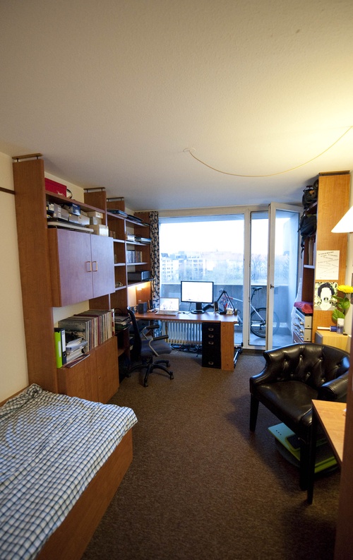 Der Wohnraum an sich hat etwa 17qm. Im Eingangsbereich befindet sauf der rechten Seite ein großer Kleiderschrank und Garderobe. Das Zimmer ist nach Süden hin ausgerichtet, wobei die ganze Seite zum Balkon komplett verglast ist. Somit ist der Raum sehr hell und gibt zugleich Ausblick auf einen kleinen Park. Im Sommer sieht man auf ein wunderschönes Blätterdach hinab. Im Keller befinden sich 5 Waschmaschinen und 3 Trockner, ein Waschgang für 2€ und der Trockner für 1,50€.