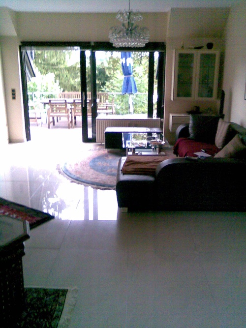 Marmor-Bad mit Badewanne, Flur und grosses Wohnzimmer mit grossen, hochwertigen, weissen Fliessen. Einbauküche mit Spülmaschine, E-Herd und Mikrowelle.