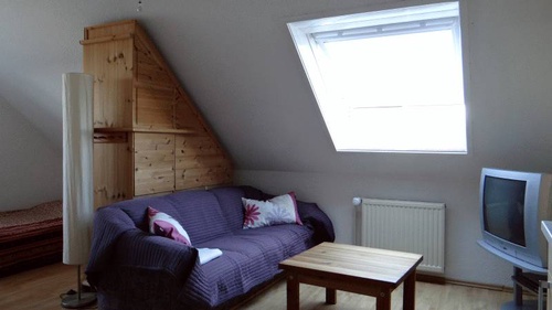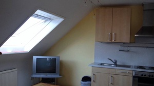 eingerichtet mit Einbauküche, Essecke, Schrank, gut gepolstertem Sofa und bequemer französischer Liege. Geschirr, Töpfe und Besteck vollständig, bei Bedarf auch Bettzeug. Das Appartement verfügt über einen digitalen Sat-Receiver mit Fernseher.