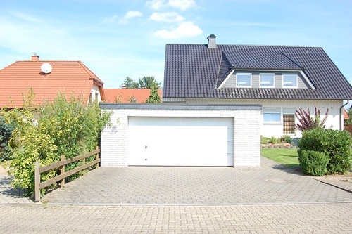 Zwei PKWs können in der Doppelgarage abgestellt werden. Sie bietet zusätzlich Platz für Fahrräder und Gartengeräte.