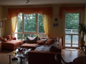 Im Wohn- und Schlafzimmer sowie im Flur Laminat, Küche und Bad gefliest. Im Wohnzimmer befindet sich ein Kamin (!!!). Zur Wohnung gehören 2 Tiefgaragenplätze. Im Waschraum steht ein Gemeinschaftstrockner zur Verfügung. Der Balkon hat Südwestausrichtung. Die Einbauküche kann inclusive aller Elektrogeräte gegen Abstand übernommen werden.