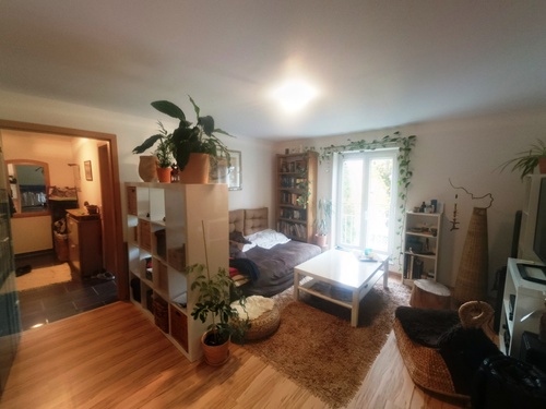 Durch den Hausflur geht man in das gemütliche offene Wohnzimmer, angrenzende an dieses befindet sich die offene große Essküche mit modernen Einbaumöbel inkl. aller Elektrogeräte. Durch die offenen Wohnräume gelangen Sie sowohl in das geräumige Gäste/ Arbeitszimmer wie auch in das gemütliche Schlafzimmer. Das modern geflieste Badezimmer mit Waschbecken, WC, Wanne, Dusche sowie ausreichend Platz und Anschlüsse für Waschmaschine und Trockner erreichen Sie über Ihren Hausflur.