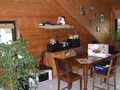 Viel Holz (Decke und Wände), Fußboden mit hellen Fliesen, Einbauküche, auch teilmöbliert möglich