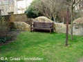* grüner Hof (Garten ähnlich) mit Sitzmöglichkeiten und vielen schönen grünen Bäumen